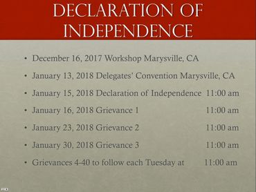 The second statement are known as the Grievances. The grievances are clear dereliction or abuses by the governor and government of California, outright violations of the Bill of Rights and the U.S. Constitution as the sovereign. Grievances provide a distinct example demonstrating to the world the governor and government of California is failing to provide a federal form of government.