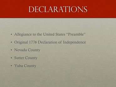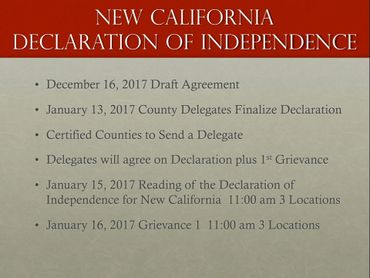 The first is the actual Declaration which severs the political connections between New California and the State of California while and summarizing the motivations for seeking Independence.